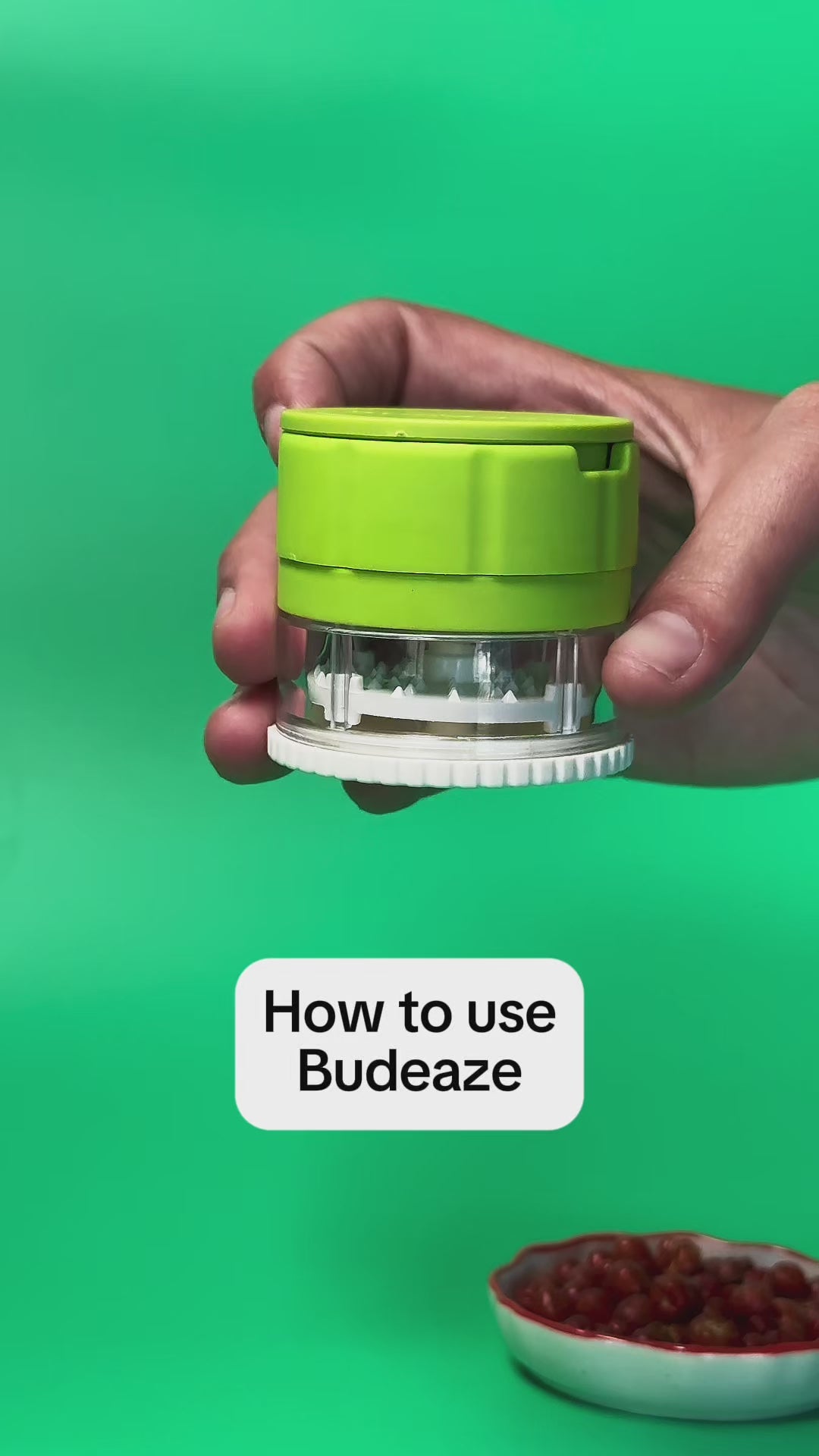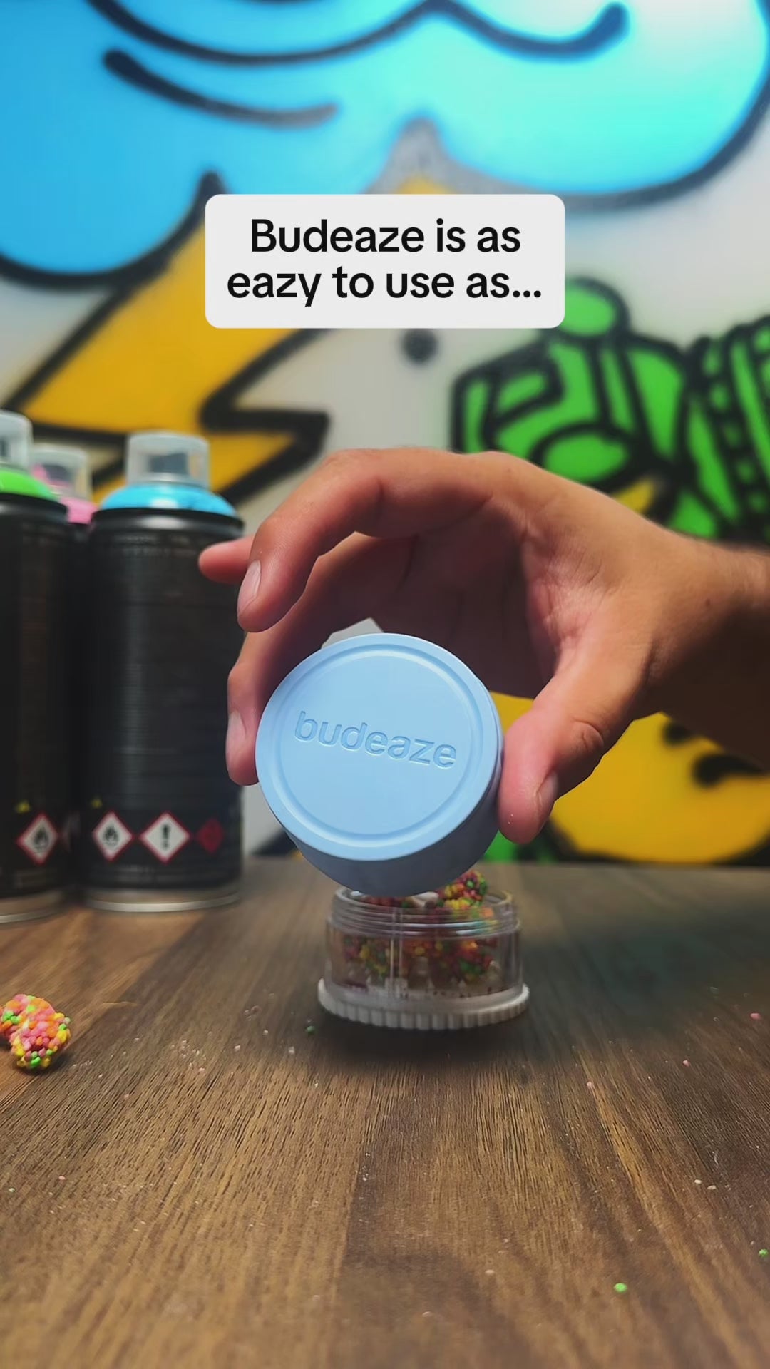 Budeaze works similarly to a pepper grinder — gravity allows the ground material to fall into the lid.